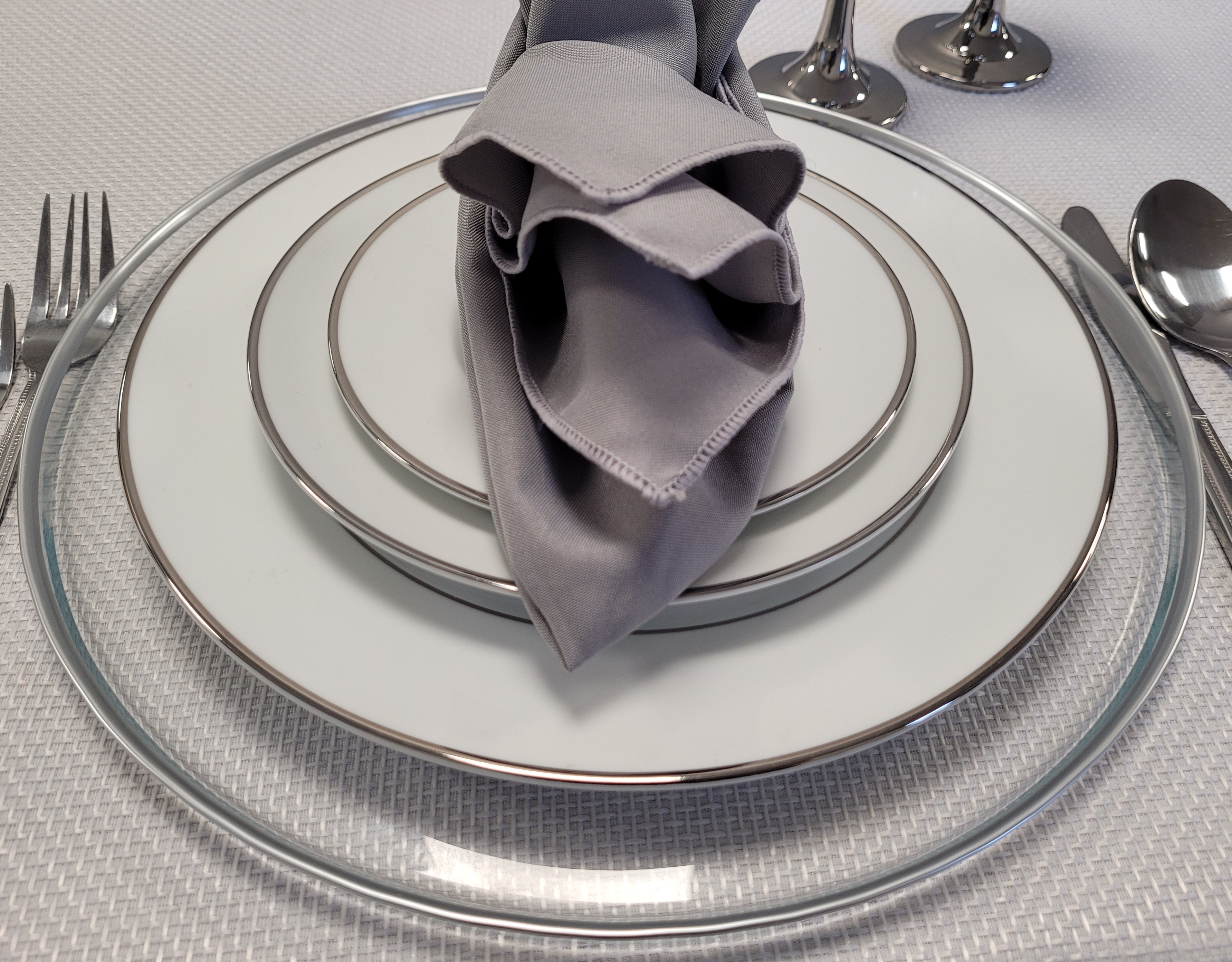 13″ Modern Clear Charger W/Silver Rim Rental CR107